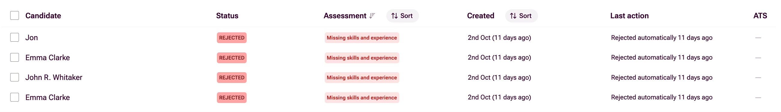 Candidates now default to the Inbox or Shortlist until someone on your team manually rejects them, either individually or in bulk. You can also clearly see where candidates start falling below your minimum criteria, making it easier to identify who to progress and who to bulk reject with confidence.